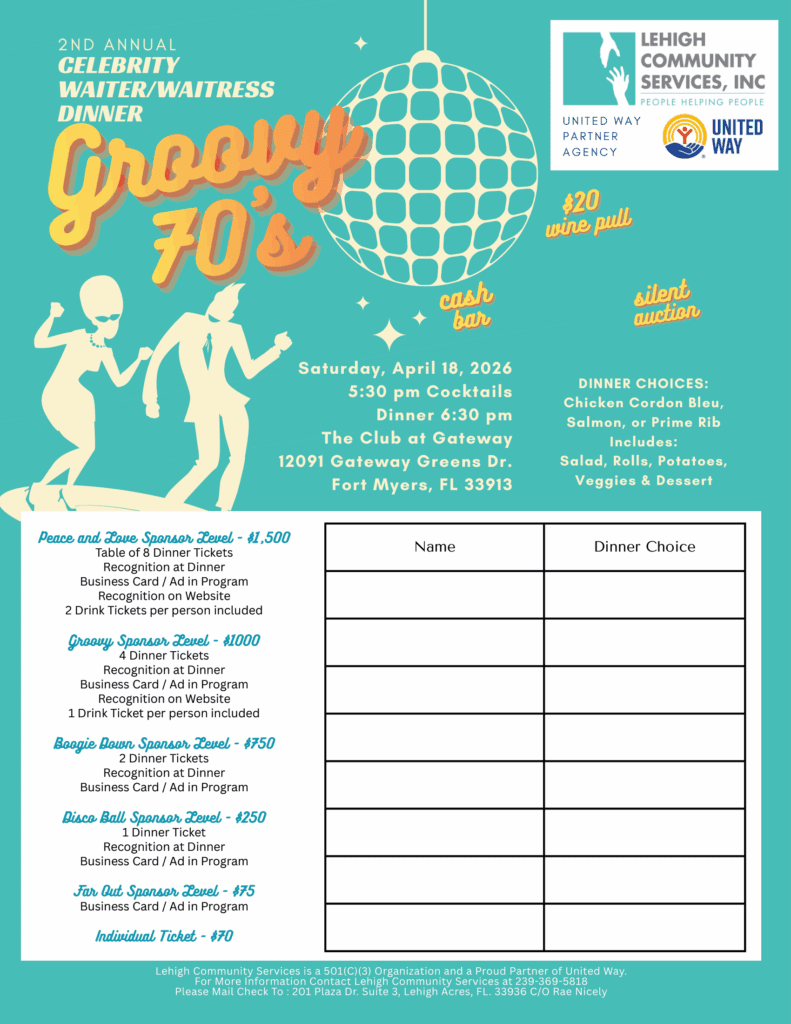 Proceeds from the evening will benefit Lehigh Community Services, a nonprofit 501(c)(3) organization and United Way partner agency dedicated to assisting families and individuals in need throughout the Lehigh Acres community.